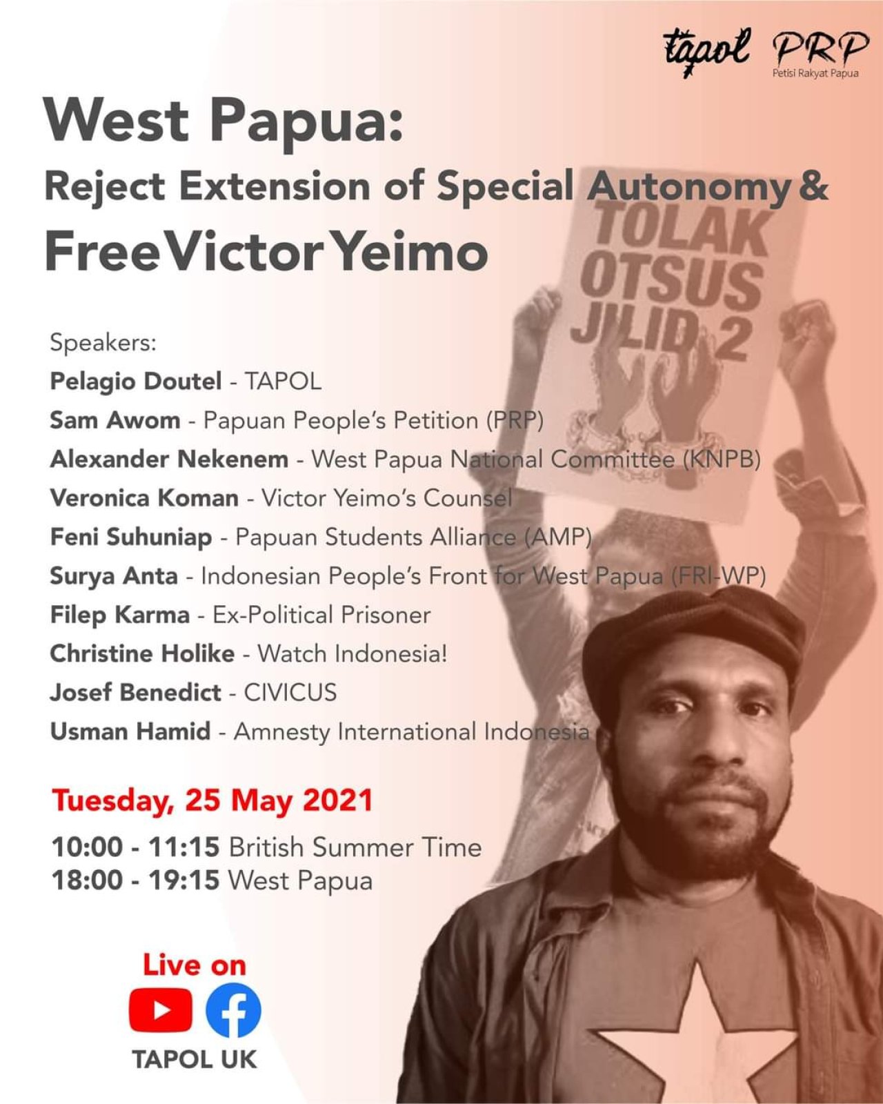 Die Menschen in West Papua lehnen die Verlängerung und Überarbeitung des Sonderautonomiegesetzes ab. Victor Yeimo ist der internationale Sprecher der Papuan People’s Petition (Petisi Rakyat Papua, PRP), die für die Einstellung des Gesetzes eintritt. Er wurde am 9. Mai verhaftet. Gemeinsam mit der PRP veranstaltete TAPOL am 25. Mai 2021 die Online-Veranstaltung: "Reject Extension of Special Autonomy & Free Victor Yeimo". Darin gaben westpapuanische Basisorganisationen und weitere internationale NGOs Unterstützungserklärungen ab. Watch Indonesia! schloss sich mit einer Erklärung an.