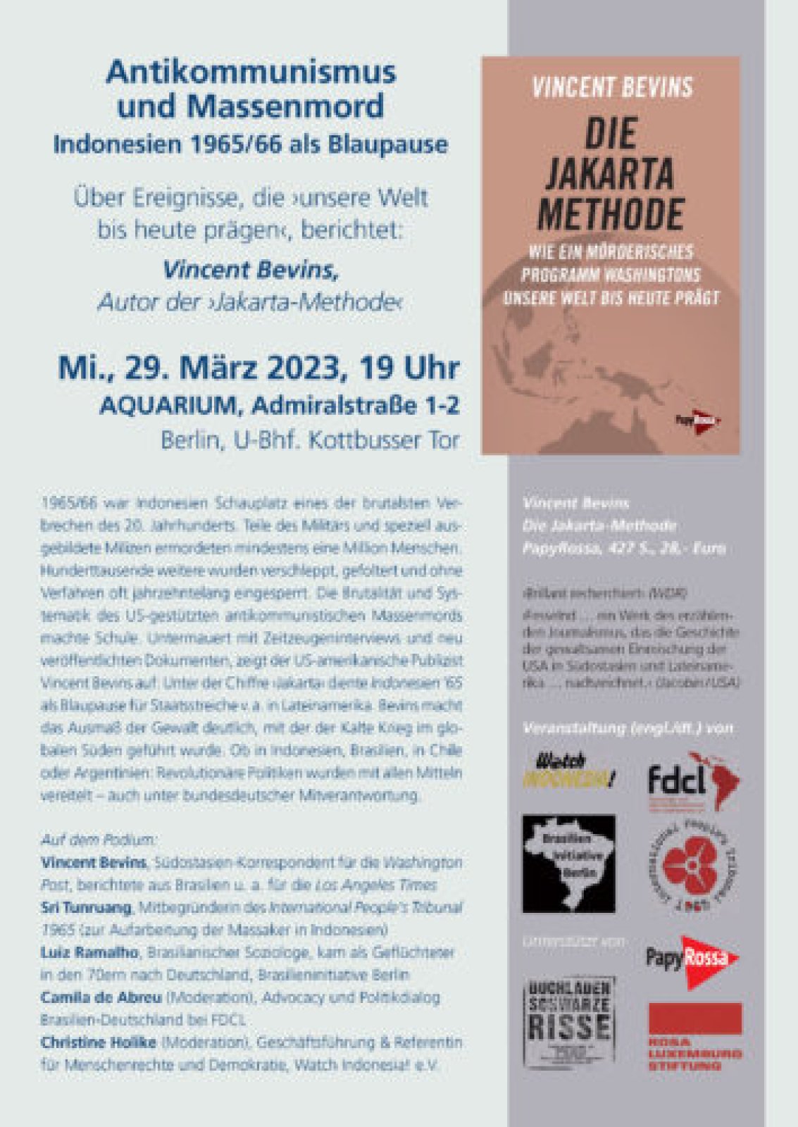 1965/66 war Indonesien Schauplatz eines der brutalsten Verbrechen des 20. Jahrhunderts. Teile des Militärs und speziell ausgebildete Milizen ermordeten mindestens eine Million Menschen. Hunderttausende weitere wurden verschleppt, gefoltert und ohne Verfahren oft jahrzehntelang eingesperrt. Die Brutalität und Systematik des US-gestützten antikommunistischen Massenmords machte Schule. Untermauert mit Zeitzeugeninterviews und neu veröffentlichten Dokumenten, zeigt der US-amerikanische Publizist Vincent Bevins auf: Unter der Chiffre ›Jakarta‹ diente Indonesien ’65 als Blaupause für Staatsstreiche v. a. in Lateinamerika. Bevins macht das Ausmaß der Gewalt deutlich, mit der der Kalte Krieg im globalen Süden geführt wurde. Ob in Indonesien, Brasilien, in Chile oder Argentinien: Revolutionäre Politiken wurden mit allen Mitteln vereitelt – auch unter bundesdeutscher Mitverantwortung.
