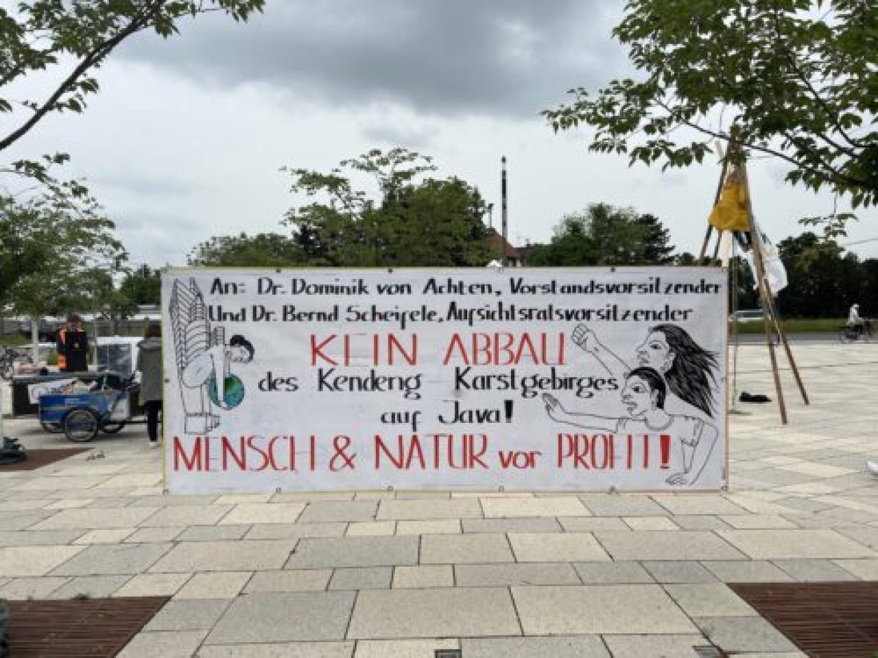 Zum 7. Mal in Folge war Watch Indonesia! am 11. Mai 2023 in Heidelberg vertreten. An diesem Tag fand die die jährliche Aktionärsversammlung der HeidelbergCement AG im SNP Dome Heidelberg statt. Ein breites Spektrum an Gruppen, hierunter Watch Indonesia!, Friday for Future Heidelberg, die die Aktionen maßgeblich trugen, dem Dachverband Kritische Aktionäre, PAX Christi, Western Sahara Ressource Watch Germany, viele hiervon vereint im End Cement-Bündnis, brachten ihren Protest gegen die menschenrechts- und umweltgefährdenden Geschäftspraktiken des Zementriesen auf die Straße setzten ihn auf die Agenda der Aktionärsversammlung.