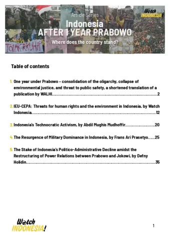 The article One Year of Prabowo – Consolidation of the Oligarchy, Collapse of Ecological Justice, and Threats to Public Safety, an abridged translation of a publication by the Indonesian environmental organization WALHI, illustrates how the government is relying on economic growth through resource extraction, large-scale projects, and new debt, thereby exacerbating environmental destruction and social inequality. In particular, food-estate projects, the legalization of illegal palm oil plantations, and a new mining law are criticized because they destroy forests and displace Indigenous communities. WALHI also considers the so-called energy transition and climate policy to be lacking credibility, as Indonesia continues to rely on fossil fuels and large-scale industrial projects.