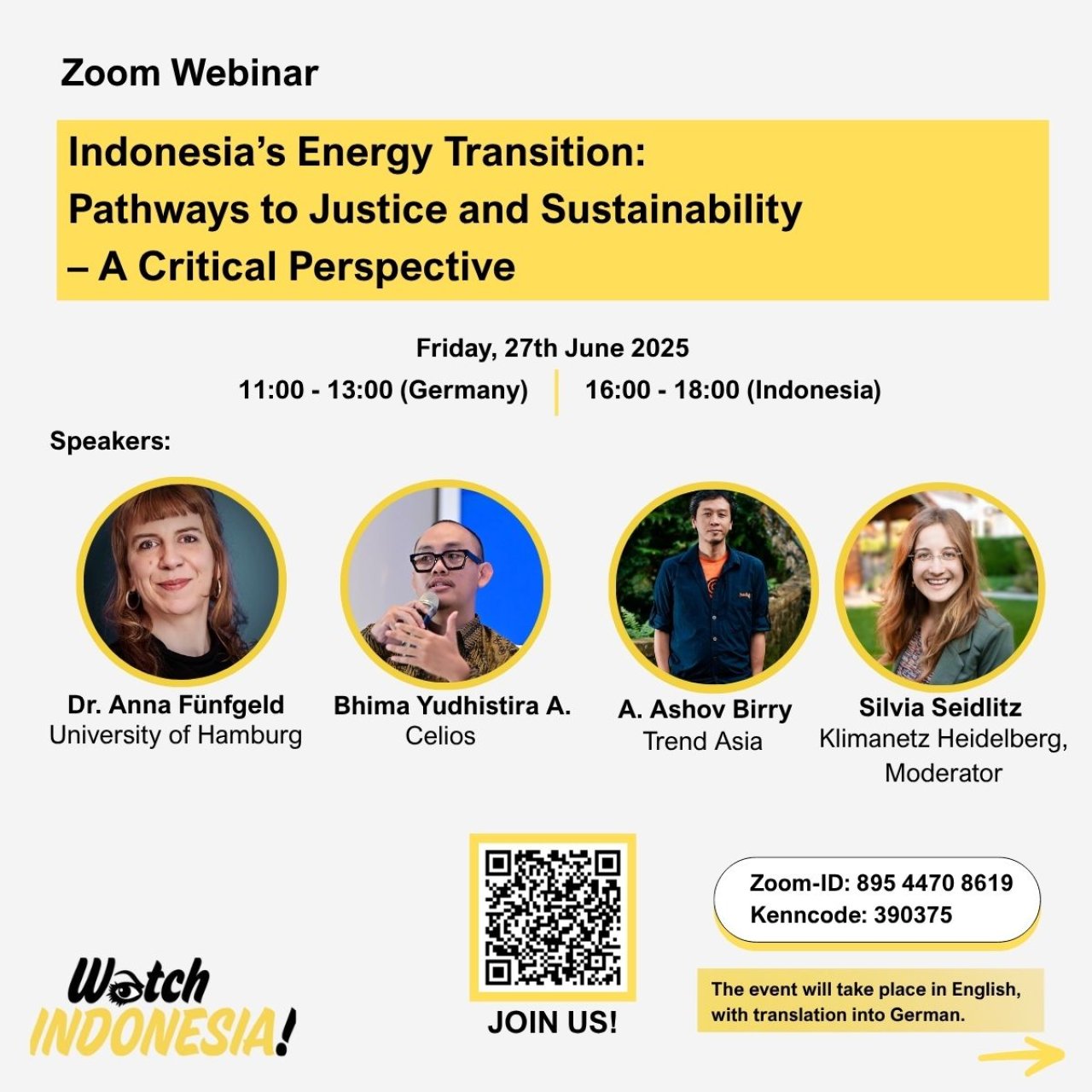 Das Webinar beleuchtet die Energiewende in Indonesien aus kritischer Perspektive. Es geht der Frage nach, wie Klimaschutzmaßnahmen sozial gerecht, menschenrechtsbasiert und ökologisch tragfähig gestaltet werden können. Im Mittelpunkt stehen die Risiken großangelegter Energieinfrastrukturprojekte, der dringende Bedarf an verbindlichen Schutzstandards sowie Möglichkeiten echter Teilhabe für Zivilgesellschaft und betroffene Gemeinschaften. Gemeinsam wollen wir Wege zu einer gerechten Energiewende finden, die niemanden zurücklässt.